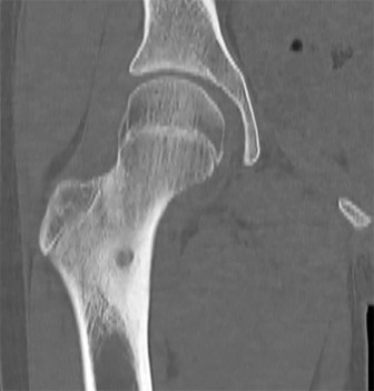 Figure 4 shows an osteoid osteoma of the femoral neck. This is characterized by a central radiolucent nidus surrounded by reactive bone with increased radiodensity. These lesions are painful because of the large amount of prostaglandin they secrete. They temporarily respond to oral anti-inflammatory drugs. Treatment is directed at eliminating the nidus and can be done through curettage, but radiofrequency ablation, which allows for a minimally invasive approach, is often used today.
