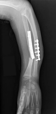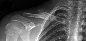 This patient has a closed midshaft clavicle fracture with significant displacement that has healed and remodeled nicely with nonsurgical treatment. Functional disability or nonunion after nonsurgical treatment of clavicle fractures in adolescents is rare. Schulz and associates showed no differences in pain, strength, range of motion, or subjective outcome scores between injured and uninjured limbs treated nonsurgically to address displaced, shortened midshaft clavicle fractures in adolescents. Bae and associates demonstrated that clavicle fracture malunions in adolescents do not cause loss of motion or strength.