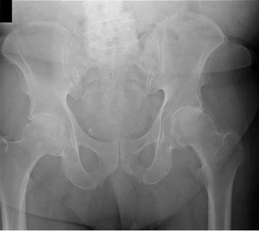 The patient’s history and examination is consistent with an intra-articular hip disorder. The radiographs show a large Cam deformity on the anterosuperior femoral neck. Pincer deformities are seen when there is overcoverage of the acetabulum on the femoral head or a deep socket. Femoroacetabular impingement can also occur in cases of acetabular retroversion. The radiographs do not demonstrate these findings. Signs of femoral head collapse and sclerotic lesions are seen in avascular necrosis but are not present here. Obesity plays a role in development of hip arthritis, but its contribution is not fully known and not the major cause of pain in this patient.