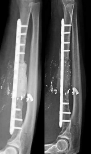 Illustration A shows the same patient in Figure A following stage 1 of Masquelet (left) with debridement, placement of a cement spacer and internal fixation; on the right is the same patient following stage 2 with bone grafting.