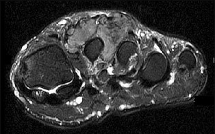 The MRI scans show a distal biceps tendon avulsion with significant retraction. When addressing these injuries, a single-incision approach has been associated with an increased risk of lateral antebrachial cutaneous nerve injury. A two-incision approach has been associated with an increased risk of heterotopic ossification, second surgeries and posterior interosseous nerve injury.