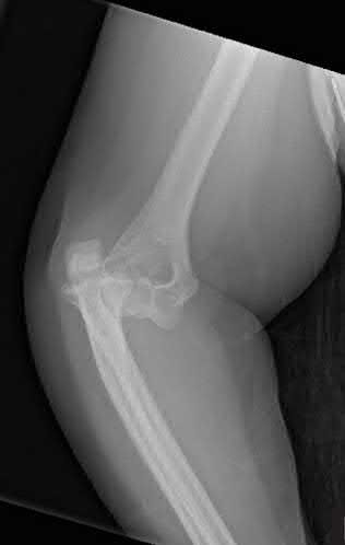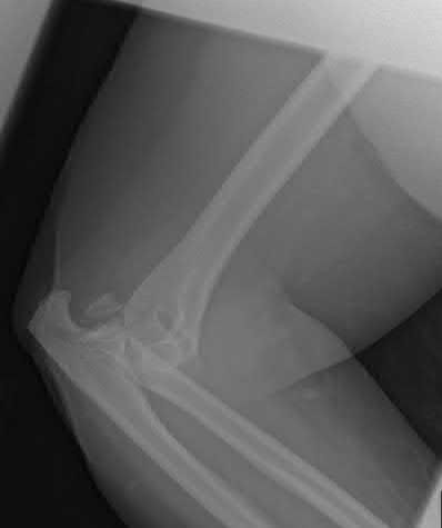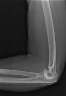 DISCUSSION..The radiographs reveal ulnohumeral arthrosis with relative sparing of the radiocapitellar articulation secondary to underlying osteoarthritis. Arthrosis of the elbow joint in this
