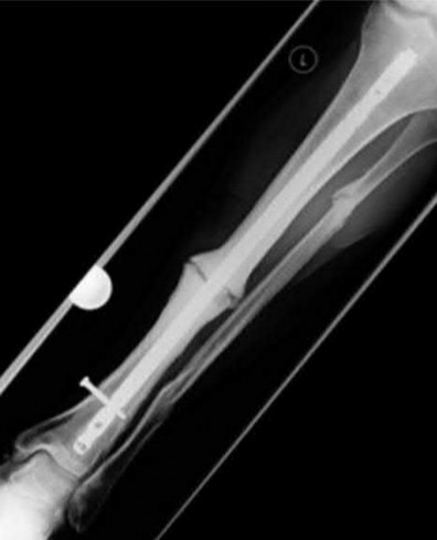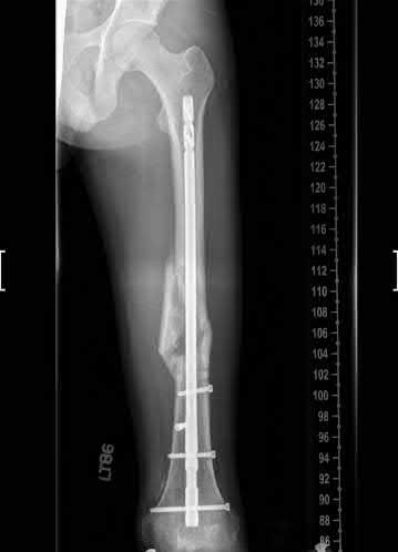 The patient is treated with emergent open reduction and internal fixation via a lateral approach to the distal femur. The peroneal nerve is found intact but is under pressure by a proximal bone fragment. After fixation, there is near-anatomic fracture reduction and no tension on the nerve. The patient is comfortable at a postsurgical check 4 hours later. Her toes