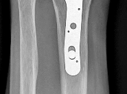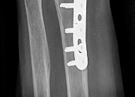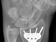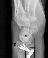 at which flexor tendons are most closely opposed to the distal radius (Figure 4). In this scenario, the lateral radiograph shows that the plate is not distal to the watershed line (W) and is between the critical line (C) and the line parallel to the volar cortex of the radius (R). This is the optimal position for the plate. Placement of a volar locking plate distal to the watershed line of the distal radius and excessive plate prominence has been associated with FPL tendon rupture. This patient is only 2 weeks past surgery and there is some FPL function. FPL weakness after volar distal radius plating is common and has been seen in as many as 50% of patients. This usually recovers spontaneously by 2 months, and no treatment is needed. A nerve conduction study would be indicated if an anterior interosseous nerve compression were considered, but it is too early for this test. A CT scan could be obtained to judge the alignment of the fracture fragment and position of the screws, but it is not indicated in this case. Exploration could be performed if an FPL rupture were considered, but, because it is only 2 weeks after surgery, there is some FPL function, the plate is proximal to the watershed line, and immediate exploration is not indicated. If this does not improve after 2 to 3 months, further investigation with ultrasound or MRI would be indicated.