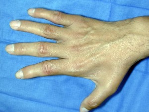 Prevalence of flexor tendon rupture after distal radius fracture is between 2% and 12%. The FPL tendon is the most common flexor tendon rupture associated with volar plating. It is usually seen with plates that are distal to the watershed line (W) and with plates extending volar to the critical line (C) (Figure below). The watershed line (W) is the location of the origin of the volar carpal ligaments and the bone prominence