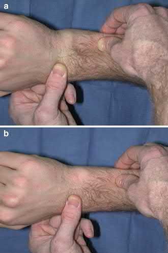 Injuries to the DRUJ often occur with distal radius fractures. The presence of an ulnar styloid fracture may signify injury to the DRUJ. After the distal radius has been fixed, the shuck test is performed. This test is completed with the elbow at 90 degrees of flexion, the forearm in neutral rotation, followed by pronation and supination. The examiner attempts to translate the ulnar in the sagittal plane. Excessive sagittal plane ulnar translation signifies DRUJ injury.