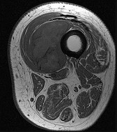 Figures 33a through 33d are the radiograph, MR images, and biopsy specimen of a 66-year-old woman with a several-month history of an enlarging thigh mass after “pulling a muscle” while playing softball. Several weeks ago her physician aspirated the cyst, but the result is no change. Treatment of this lesion should include