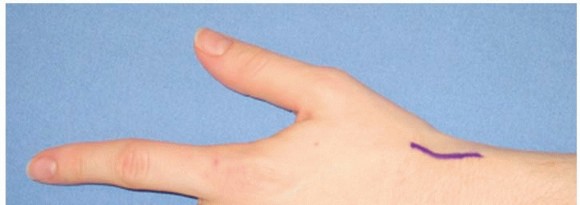 TECH FIG 2 • An incision over the dorsoradial aspect of the wrist may be used when prior surgery has been performed.