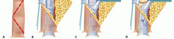 TECH FIG 4 • A. A volar skin incision is centered at the PIP joint in a Brunner fashion. B,C. The flexor tendon sheath is incised between the A2 and A4 pulleys to allow retraction of the tendons. D. The volar plate is released proximally for exposure.