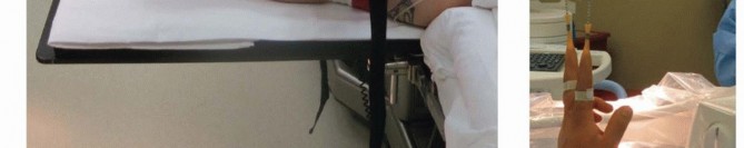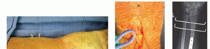 The patient is placed supine with the injured arm out on a radiolucent arm table. A nonsterile padded pneumatic tourniquet is placed on the upper arm.If arthroscopy is planned to address an unstable DRUJ, the upper arm should be stabilized to the arm table or a distraction device be made available.