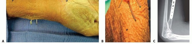 Fracture of the radial shaft with an associated distal radioulnar joint (DRUJ) dislocation ( FIG 1A,B)It is well established that anatomic stabilization of the radial shaft fracture typically results in a stable DRUJ that can be treated nonoperatively with a period of immobilization.When the DRUJ is either irreducible or unstable, following anatomic reduction and compression plating of the radius fracture, operative stabilization of the DRUJ is required.Pediatric injury is not discussed in this chapter.