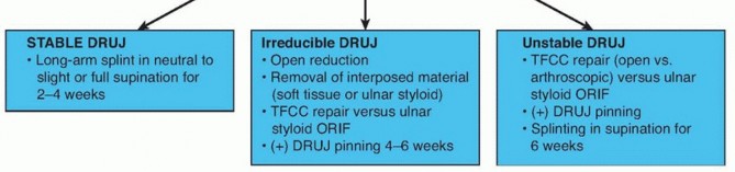 |1.Confirm reduction with intraoperative radiographs. Immobilize forearm|Radius is anatomicallyreduced and DRUJ is irreducible.1.Proceed with open reduction to removed interposed soft tissuestructures and open repair of TFCC (with radioulnar pinning).Radius is anatomicallyreduced and DRUJ is grossly unstable.1.Proceed with radioulnar pinning (4-6 weeks) verses supination splintingfor 6 weeks.2.Consideration can be giving to open verses arthroscopic TFCC repair (with radioulnar pinning).Follow-up examination1.Confirm at each follow-up DRUJ reduction radiographically. If there isany question of subluxation, evaluate axial imaging with CT scan.in neutral to slight supination in long-arm cast or splint in neutral for 2-4 weeks to allow for TFCC healing.Radius is stabilized and DRUJ is stable.