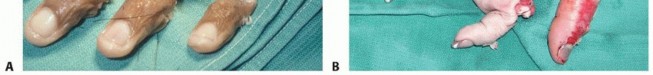 FIG 1 • A. This hand sustained sharp amputation of the digits from a table saw. The narrow zone of injury made the digits ideal for replantation. B. This hand sustained a crush injury. The resultant wide zone of injury prohibited successful replantation. Expected survival rates of replanted digits are 80% or higher, with even higher survival rates in revascularized digits.