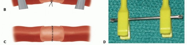 TECH FIG 4 • A-C. Arterial repair is performed using the operating microscope. A tension-free anastomosis of normal intima to normal intima is essential for survival of the replanted part. D. The vascular approximating clamp should have less than 30 g of closing pressure. Two clamps on a sliding bar allow for tension-free positioning of the vessel ends. If adequate blood flow is not obtained, evaluate for all reversible causes of vasospasm, including hypotension, hypovolemia, acidosis, pain, or cold. Double check that the tourniquet was deflated.Evaluate the proximal vessel for mechanical constriction.Thoroughly irrigate the lumen with warm heparinized Ringer lactate through a 30-gauge blunt-tipped needle on a 10-mL syringe.If vasospasm persists, irrigate the proximal vessel with papaverine solution (diluted 1:20 with sterile normal saline).After appropriate blood flow is established, the proximal and distal stumps are placed within the vascular approximators. Several types of approximating devices are available. We favor two clamps on a sliding bar. The clamps should have less than 30 g of closing pressure and should be limited to no more than 30 minutes of application time due to the potential for vessel damage (TECH FIG 4D).Place a microsurgical background deep to the repair site.A bolus of 3000 to 5000 U of intravenous heparin is given just before the anastomosis. After the bolus, we typically initiate a heparin drip at 1000 U per hour.Repeat inspection of the intima is performed proximally and distally to confirm its integrity. Verify that the anastomosis is tension-free and that no adventitia overhangs the lumen.Appropriately sized monofilament nylon sutures (Table 1) are used and initial sutures are placed 180 degrees apart.The size of each “bite” should be about one to two times the thickness of the arterial wall. Care must be taken to avoid damaging the intima of the vessel.One limb each of the initial sutures should be cut long for use in manipulating the vessel without directly handling it.Suture the front wall of the artery sequentially between stay sutures.Irrigate the lumen after each suture is tied, and inspect the repair site to confirm that the back wall was not captured.Flip the approximating clamp to expose the back wall and complete the anastomosis.Remove the vessel from the approximating clips and repeat the procedure on the other digital artery.Site of Repair|Suture Size|Needle Size (μm)------Palm|9-0|100Proximal digit|10-0|75Distal digit|11-0|50 Table 1 Needle and Suture Sizes