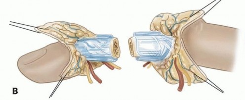 FIG 5 • A,B. Bilateral longitudinal midaxial incisions allow for easy exposure of the neurovascular bundles and dorsal veins.