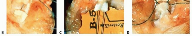 TECH FIG 2 • A. A Tajima-type suture repair is used so that the flexor tendons can be opposed and secured at the ideal time. B,C. The suture is placed in the proximal and distal ends of the tendon. D. The sutures are then tied in the repair site at the appropriate time.