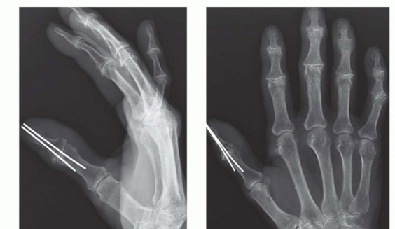 Long-term complications include pin tract infections, cold intolerance, stiffness, malunion, and nonunion.Pin tract infections usually occur more than 4 weeks after surgery. They are easily treated by pin removal and a course of oral antibiotics.Cold intolerance is almost universal. (This also is a problem in revision amputations.) Cold intolerance is expected to improve over the first 2 years, but it remains debatable whether it completely resolves.2,14 Digital stiffness is common because both the flexor and extensor tendons are repaired. Tenolysis should be delayed for at least 3 months postreplantation but has demonstrated good results.9Malunion usually results from malalignment at the time of bone fixation. Intraoperatively, rotational alignment is the most difficult to assess. Malunion is more common in proximal amputations because even slight malalignment at the amputation level is greatly accentuated at the fingertip.Nonunion is not common after replantation of the digit. It has been reported in fewer than 10% of digit replantations and rarely requires reoperation.15,16