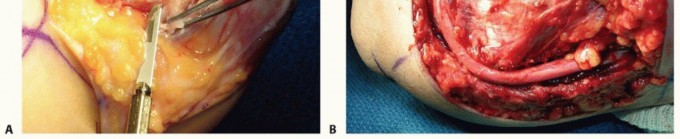 TECH FIG 4 • Anterior subcutaneous transposition. A. The subcutaneous flap at the level of the flexor pronator fascia has been developed and the nerve transposed anteriorly. B. A 1-cm fascial sling is developed from the flexor pronator mass to provide an inferior restraint for the transposed nerve. (A:
