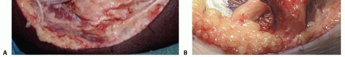 TECH FIG 6 • Submuscular transposition. The flexor pronator mass is incised (A), and the nerve is passed deep to the flexor pronator muscle mass (B). Sutures are in place to repair the muscle origin following use of a simple straight incision. (A: Copyright Amy Ladd, MD; B: Courtesy of Thomas R. Hunt, III, MD.) The median nerve and brachial artery lie in this plane. Transpose the ulnar nerve in the medial position (TECH FIG 6B).Take care to avoid injury to the medial collateral ligament complex.Flex the elbow and repair the flexor pronator mass with 3-0 Ethibond suture.Place a drain.The arm is immobilized with a pronated forearm in an elbow splint for 2 to 3 weeks at 45 to 60 degrees of flexion with progressive protected mobilization.P.848