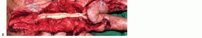 TECH FIG 3 • A. Painful expanding soft tissue mass along the common digital nerve to the third web space. The middle and ring fingers had slowly lost sensibility on the affected sides. B. MRI shows that the mass originates from the median nerve and extends to the proximal interphalangeal joint. Low-intensity normal nerve fascicles are seen coursing through the high-intensity fatty mass. C. At surgery, normal fascicles cannot be distinguished from the fibrofatty proliferation. D. Specimen. E. Sural nerve graft to the middle and ring finger proper digital nerves. Sagittal plane MRI images will show the extent of the lesion (TECH FIG 3B).Surgical exposure begins with an open carpal tunnel release to identify the transition zone between normal and abnormal nerve. The incision is carried distally in a Brunner zigzag type of fashion to find the end of the lesion (TECH FIG 3C).The hamartoma is excised en bloc at healthy-appearing fascicular margins (TECH FIG 3D). A sural nerve is harvested and interposed as a cable graft (TECH FIG 3E).Diagnosis1. A nerve tumor must be part of the differential diagnosis for any distal upperextremity mass.2. Anticipation allows for appropriate preoperative planning and discussions with the patient.Nonsurgicalmanagement1. Watch for signs of malignancy, including increasing nerve dysfunction, rapidgrowth, and pain.2. Plexiform neurofibromas seen in patients with NF type 1 have a high risk for malignant change.Surgicalapproach1. Masses should be resected through an extensile approach; avoid transverseincisions.2. Tumors that are invasive into the adjacent tissue are likely malignant. An incisional biopsy should be performed and the wound closed.Tumorresection1. Loupe magnification and microinstruments facilitate enucleation of a tumor(schwannoma).2. A microscope should be available should microdissection or nerve resection and reconstruction become necessary (neurofibroma).P.1329