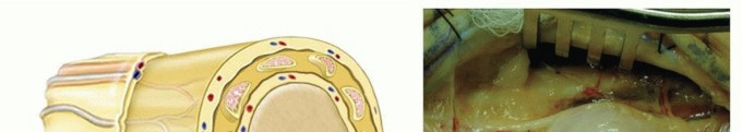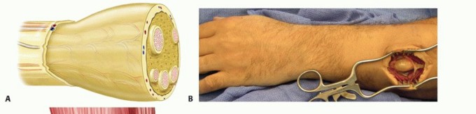 Peripheral nerves consist of axons surrounded by a nerve sheath (FIG 1).The epineurium is a thin outer layer of connective tissue containing blood vessels that supply the nerve. Perineural cells form a strong cellular layer, the perineurium, surrounding each fascicle (bundle) of axons. An endoneurial layer of protective Schwann cells surrounds each individual axon.