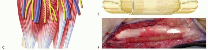 TECH FIG 2 • A. Fascicles are intertwined with tumor cells in a neurofibroma; tumor resection often requires excising a segment of nerve. B. A neurofibroma of the posterior interosseous nerve (PIN). This tumor was inseparable from normal nerve fascicles and excision resulted in permanent loss of finger extension. C. Branches of the MABC run with the basilic vein. The anterior branch is a good match for a digital nerve and can be harvested near the elbow. D. The ulnar digital nerve of the thumb has been grafted with the MABC in this patient, with prior nerve tumor resection and iatrogenic soft tissue loss. E. Nerve conduits provide an environment for nerve regeneration and have been shown to be as good as or better than nerve grafts in many situations. F. A digital neurofibroma was resected and a nerve conduit placed to bridge the intercalary defect. The soft tissues were slow to heal due to motion about the conduit at the metacarpophalangeal joint. Newer, less rigid collagen nerve guides may be better suited for use around the finger joints; however, human trials are lacking.
