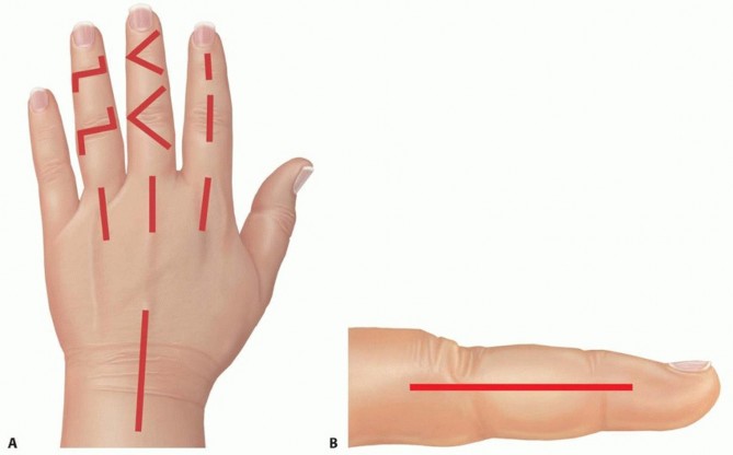 TECH FIG 1 • A. Sample incisions for open dorsal drainage of the IP, MP, and radiocarpal joints. B.