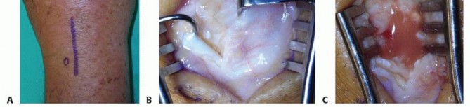 TECH FIG 3 • A. Incision for open drainage of the wrist. B. The distal third of the extensor retinaculum is released and the interval between the third and fourth dorsal compartment developed. C. The capsule is arthrotomized with an inverted T. The joint should be thoroughly irrigated with gravity cystoscopy tubing or a bulb syringe.Pulse lavage should be avoided due to its potential to cause additional soft tissue injury.The joint should be ranged during irrigation to maximize the effect of the lavage.The joint surfaces are inspected for articular damage.Leave a small wick or drain in the joint and loosely close the skin around the wick.Primary closure of the joint risks reaccumulation of the purulence. Typically, two to three loosely placed 4-0 nylon sutures will be sufficient.Place the wrist in a volar splint for comfort and encourage limb elevation.Diagnosis1. Diagnosis is best accomplished by joint aspiration and analysis.Antibiotics1. Obtain cultures before beginning antibiotics.2. Empiric antibiotics should be tailored to the most likely organism based on mechanism of injury and patient factors.Aspiration1. Avoid using larger syringes because the vacuum created can collapse the jointand may be less effective for aspiration.Arthroscopicdrainage1. Identify the surface landmarks of the joint and avoid inadvertent injury to thedorsal tendons and cutaneous nerve.2. Be prepared to convert to an open procedure if adequate exposure and débridement are not possible.Open surgicaldrainage1. Be prepared to perform a second open surgical débridement if symptoms do notimprove.