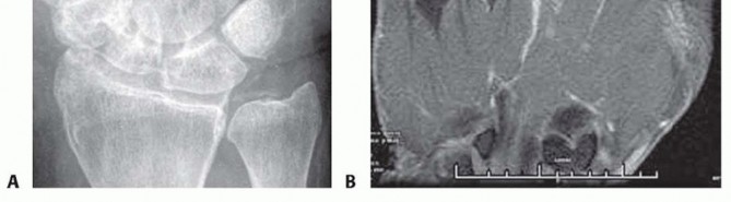 FIG 2 • A. Radiograph showing chondrocalcinosis of the triangular fibrocartilage complex from chronic pseudogout. B. Coronal T2-weighted MRI of an MP joint with underlying septic arthritis. Note the normal bone signal but the presence of high signal within the joint from the fluid and surrounding soft tissue inflammation. A low WBC count with a high percentage of neutrophils (>90%) may indicate an early septic arthritis.11 A joint glucose of 40 mg/dL or less compared with the fasting blood glucose level also suggests a septic process.7Crystal analysis is necessary to rule out the presence of gout or pseudogout because they also can present similarly, including an elevated WBC count in the aspirate.The role of imaging studies early in the course of the septic process is limited. Radiographs may reveal joint distention, presence of foreign bodies, osteomyelitis, air in the soft tissues, and chondrocalcinosis (characteristic of both gout and pseudogout) (FIG 2A). Later radiographs may reveal joint destruction.Magnetic resonance imaging (MRI) is effective in diagnosing early septic arthritis and in differentiating it from osteomyelitis or overlying tenosynovitis (FIG 2B).