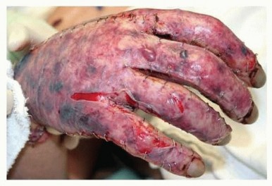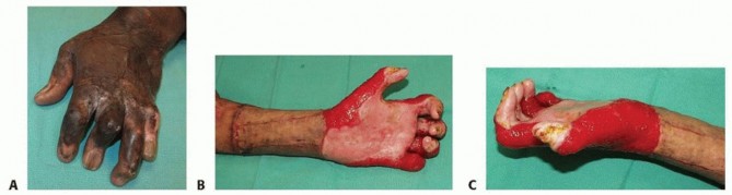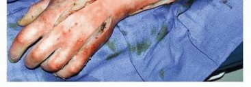 FIG 2 • Upper extremity burn injury demonstrating superficial, partial-thickness, and full-thickness burns.