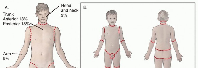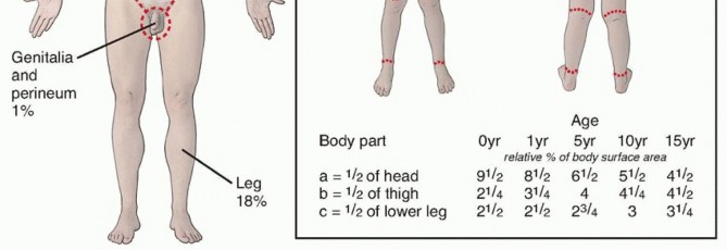 FIG 3 • Lund-Browder diagram to estimate burn wound size. The “rule of nines” is useful to estimate the total percentage of body surface area involved (FIG 3).Alternatively, the area can be estimated using the patient's palm, which is approximately 1% of the total body surface area.Resuscitation is guided by the total body surface area involved, patient weight, and urine output, with adjustment made for pediatric patients.Because burns may continue to evolve over 48 to 72 hours following injury, serial examinations are required to adequately determine burn depth.P.1237Infection, inadequate resuscitation, poor wound care, and malnutrition can result in burns progressing from superficial to deep partial-thickness or full-thickness burn injuries. Close attention to nutrition and resuscitation are imperative.In general, burns that are not anticipated to heal within 3 weeks should undergo operative excision and grafting within the first few days of the burn injury.Early tangential excision of the burn is indicated within the first few days of injury and is performed in the operating room under general anesthesia.Scar maturation continues for approximately 1 year.True keloid formation is rare; however, hypertrophic burn scars are common and can be managed by the conservative measures listed earlier.