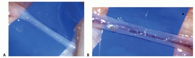 TECH FIG 1 • A,B. View through the operating microscope before (A) and after (B) removal of the adventitia from a common digital artery.(continued)