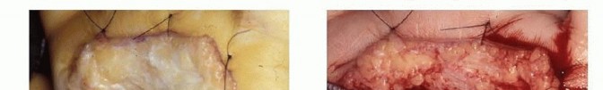 TECH FIG 1 •(continued)C,D. Radical or extensive digital sympathectomy before (C) and after (D) stripping the adventitia from the distal ulnar artery, superficial palmar arch, and common digital arteries to the index-middle, middle-ring, and ring-small finger web spaces.