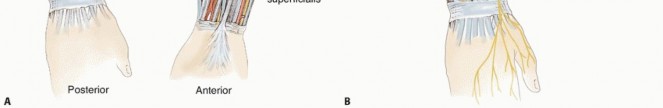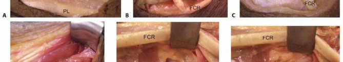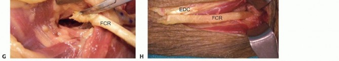 Three general exposures are used:P.895Radial incision with volar exposure for FCR and PT and dorsal exposure for the ECRB and ECRL Distal dorsal incision for EDC exposureIndividual approaches for harvest of the FCU, FCR, and FDSThe ideal tendon transfer tension is based on the individual muscle properties. In general, the optimal tension is established at the peak of the length-tension curve for the donor muscle while the wrist and fingers are maintained in the ideal position. Because this donor muscle position is difficult to determine intraoperatively without specialized equipment, this point reasonably corresponds to the midpoint of the passive muscle excursion. The ideal joint position for each transfer is discussed with the individual transfers.