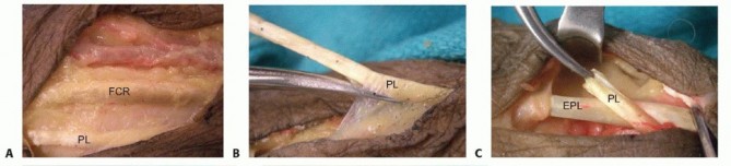 Digitorum Superficialis to Extensor Indicis Proprius/Extensor Pollicis Longus; Ring Finger Flexor Digitorum Superficialis to Long, Ring, and Small Extensor Digitorum Communis; and Palmaris Longus to Abductor Pollicis Longus6,10**** Perform oblique palmar incisions to harvest the FDS of the long and ring fingers.Include both slips for transfer.Suture the remaining distal tendon to the volar plate or soft tissue to prevent proximal interphalangeal hyperextension.Use the volar incision to retrieve the FDS tendons and to harvest the PL.Precisely expose the IOM and make preparations for tendon transfer as discussed in the preceding section.Perform a dorsal incision and EDC exposure similar to that detailed in the preceding section. Transfer the two FDS tendons dorsally through the IOM.The long finger FDS is transferred to the EIP and the EPL. The ring finger FDS is transferred to the long, ring, and small EDC tendons.Set tension at the wrist at 30 degrees and at the MP joint at full extension. Secure the transfer with 3-0 or 4-0 suture.The PL is harvested as detailed for the EPL transfer.The radial subcutaneous route also is used to transfer the PL to the abductor pollicis longus (APL), proximal to the retinaculum.The location of this transfer is slightly more proximal to the PL than the EPL transfer due to the length available for the APL.Set tension in near-full thumb abduction at wrist 30 degrees; secure with 3-0 or 4-0 suture.5. Finger Extension and Thumb Abduction through Flexor Carpi Ulnaris to Extensor Digitorum Communis and Extensor Pollicis Longus and Palmaris Longus to Abductor Pollicis LongusAlthough one donor muscle is not typically transferred to two recipients,3 an FCU transfer to the EPL and EDC has been described. This may be combined with a wrist extension transfer.The technique is similar to that discussed for the FCU to EDC transfer along the ulnar subcutaneous route. The tension is such that the thumb and index metacarpal are parallel.PEARLS AND PITFALLS