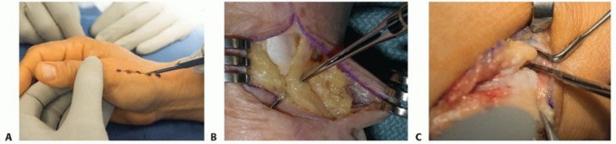 TECH FIG 1 • A. Dorsal longitudinal incision along the ulnar aspect of the first dorsal compartment. B. Surgical incision with identification of the radial sensory nerve. C. Dorsal branch of radial artery is mobilized and protected by retracting it dorsally and proximally. The first dorsal compartment is released.Identify the dorsal branch of the radial artery deep to the abductor pollicis longus and extensor pollicis brevis tendons running in a dorsal and ulnar direction. Carefully mobilize and protect it by retracting it dorsally throughout the remainder of the case (TECH FIG 1C). The radial artery courses directly over the STT joint.Identify the base of the thumb metacarpal, and complete a longitudinal capsulotomy to expose the base of the metacarpal, the entire trapezium, and the distal aspect of the scaphoid.Fluoroscopy is used to confirm the location of the CMC joint if necessary.