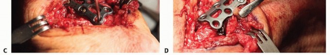 TECH FIG 3 • A. A six-hole plate is applied across the CMC joint. B. Two screws have been placed through the plate into the trapezium. C. Plate being applied onto the thumb CMC. D. Distal radius bone graft being packed into the CMC joint. Distal radius bone graft is then packed into the fusion site (TECH FIG 3D).At this time, final assessment of clinical alignment and fluoroscopic evaluation (position, bony contact, hardware placement/screw length) are performed (see FIG 2A,B).Irrigate the wound lightly with saline. Close the capsule with a nonabsorbable suture (3-0 Ethibond), repeat irrigation, and deflate the tourniquet to confirm hemostasis as the radial artery and venae comitantes are within the operative field. Close the skin with 4-0 nylon horizontal mattress sutures.If mild thumb MCP joint hyperextension is noted at this juncture, pin the MCP joint in 20 degrees of flexion with a single 0.045 Kirschner wire or consider a volar capsulodesis. In our experience, correction of the fixed flexion and adduction of the thumb metacarpal often improves MCP position with pinch so that operative intervention at the MCP joint is infrequent.Apply soft sterile dressings and a well-padded short-arm thumb spica splint.