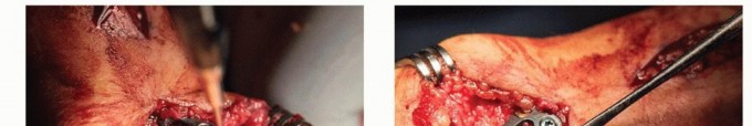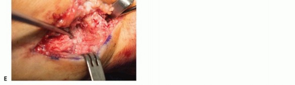 Distal radius autograft is harvested to pack into the arthrodesis site.Extend the dorsal incision proximal to Lister tubercle and bluntly spread through the subcutaneous tissues to expose the extensor retinaculum.Incise the retinaculum sharply over the radial edge of Lister tubercle to expose the tubercle's surface within the second extensor compartment.P.1064Use a curette as a hand drill (spin with compressive force applied by hand) into the radial border of Lister tubercle. This provides access to the medullary canal through an area of thin cortex. Cancellous bone graft is harvested.