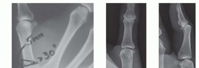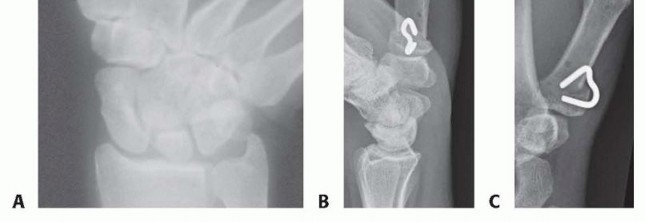 TECH FIG 1 • A. Radiograph showing planned osteotomy. B,C. AP and lateral postoperative thumb radiographs. Use a microsagittal saw to score the metacarpal 1 cm distal to its base transversely, but do not make a complete cut through the volar cortex.Leave a new saw blade in that partial osteotomy site and use a second blade about 5 mm distal to the first cut at an angle of 30 degrees so that the two blades intersect at the volar cortex.Remove the wedge of bone, extend the distal metacarpal and compress it against the proximal fragment, and place one 11 × 8 staple (OSStaple, BioMedical Enterprises, Inc., San Antonio, TX).Typically, I maintain the reduced position of the metacarpal while my assistant predrills and then places the staple (TECH FIG 1B,C).Perform a layered closure of the periosteum and skin and place an overlying thumb spica splint.1. Extension Osteotomy with Kirschner Wire and Tension Band FixationThe technique is as described for staple fixation except for the use of Kirschner wires.Use a microsagittal saw to score the metacarpal 1 cm distal to its base transversely, but do not make a complete cut through the volar cortex.Leave a new saw blade in that partial osteotomy site and use a second blade about 5 mm distal to the first cut at an angle of 30 degrees so that the two blades intersect at the volar cortex.Remove the wedge of bone and use a 0.045-inch Kirschner wire to place a transverse hole on either side of the osteotomy.Pass a 22-gauge wire radial to ulnar and ulnar to radial.Place a 0.045-inch Kirschner wire retrograde through the distal osteotomy site, exiting out the ulnar aspect of the thumb, and compress the osteotomy by extending the distal metacarpal.With an assistant maintaining compression, tighten the wire, cut it, and bend it beneath the thenar musculature. Then advance the Kirschner wire anterograde.Cut the Kirschner wire external to the skin to facilitate removal, and repair the periosteal origin of the thenar musculature with absorbable suture.P.1059