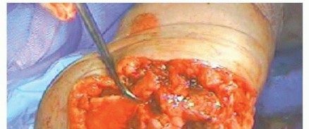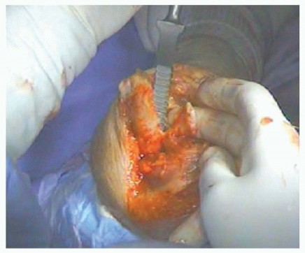 TECH FIG 1 • After skeletonizing, the distal humerus entry into the medullary canal is gained with a rongeur, removing bone from the articular surface in line with the midpoint of the olecranon fossa.