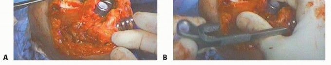 TECH FIG 7 • A. A wafer of bone graft from the resected portions of the humerus is contoured to fit along the anterior cortex of the humerus. B. The anterior flange of this humeral component seats around the bone graft's position along the anterior cortex.