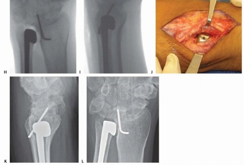 TECH FIG 1 •(continued)C. Longitudinal dorsal incision made to expose ulnar head and elevate ulnar-based flap of capsule. D. Reflected extensor retinaculum with preserved ECU. E. Resected ulnar head measured to match partial ulnar head prosthesis. F,G. Intraoperative Fluoroscan demonstrating partial ulnar head resection. H,I. Intraoperative Fluoroscan images following placement of implant and soft tissue used to stabilize the prosthesis during closure. J. The ulnar medullary canal is reamed. K,L. Postoperative radiographs of partial ulnar head prosthesis.