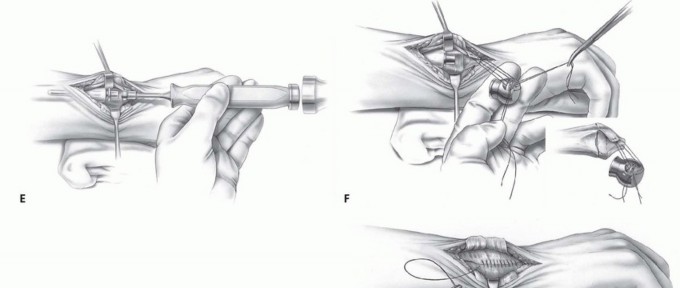 TECH FIG 2 • A. A longitudinal incision is made between the FCU and ECU tendons on the ulnar border of the distal forearm and wrist. B. The cutting guide helps determine the level of resection of the ulnar head. The distal notches are for use with the three head sizes and standard stem, and the proximal notches are for use with a collared stem in cases of previous resection or resorption of the distal ulna. C. An oscillating saw is used to resect the ulnar head at the determined level. D. The ulnar medullary cavity is reamed using broaches.(continued)
