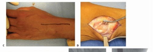 TECH FIG 4 • A. Intraoperative photograph of implantation with the Aptis system. The dorsoulnar skin incision is placed between the fifth and sixth extensor compartments. B. A large ulnar-based flap of retinaculum is raised for later interposition between the ECU tendon and the implant. C. The ulna is displaced volarly with retractors to expose the interosseous surface of the radius and the sigmoid notch.