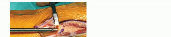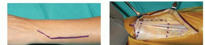 An incision is made along the ulnar border of the shaft of the distal ulna in line with the ulnar styloid. The interval between the flexor carpi ulnaris (FCU) and extensor carpi ulnaris (ECU) tendons is developed for access to the ulna.A dorsal approach is an alternative and is indicated for partial head replacement. Access to the articular portion of the ulnar head is gained through the floor of the fifth extensor compartment.