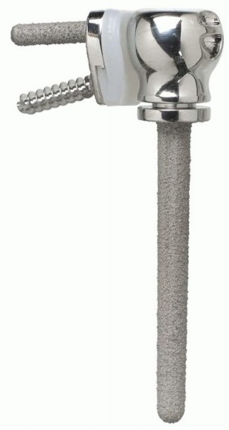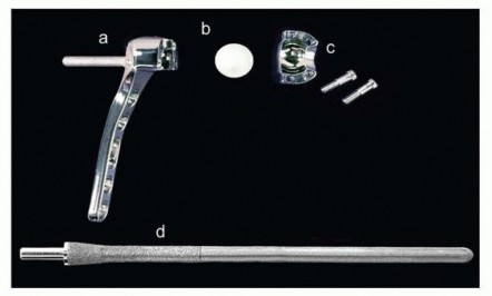 FIG 3 • The Aptis system (Aptis Medical, Louisville, KY) replaces the entire DRUJ with a constrained articulation. The components include (a) radial plate with socket, (b) polyethylene ball, (c) hemisocket with screws, and (d) ulnar stem with peg.The radial component consists of a plate with a polyethylene-lined metal sphere affixed to the interosseous surface of the radius.The ulnar stem has a protruding peg that is captured and rotates within the polyethylene liner. The stem has limited freedom of proximodistal and limited dorsopalmar motion, simulating normal DRUJ mechanics.