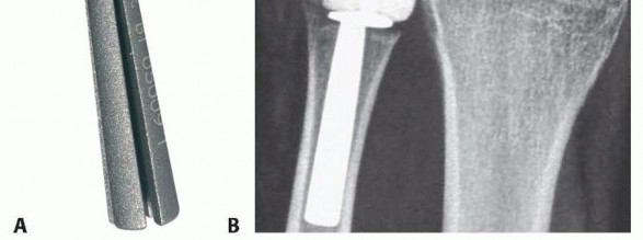 FIG 1 • The Eclypse partial ulnar head replacement (Tornier Surgical Implants, Tornier, Inc., Rodborough Road, FR) consists of an expandable titanium stem with a mobile pyrocarbon spacer (A). When implanted, the prosthesis preserves the ulnar styloid and attachment of the TFCC (B).