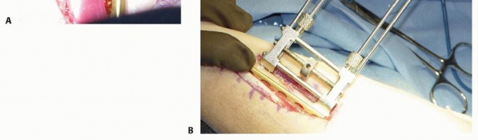 Dial down the small distractor apparatus to achieve compression at the osteotomy site and bone-to-bone abutment (TECH FIG 4A).A reduction clamp is valuable in guiding and then securing the fragments as compression is applied.Examine the radioulnar relationship under fluoroscopy to ensure adequate correction of ulnar variance and DRUJ congruence.Additional bone resection followed by repeat reduction and compression can be easily achieved if necessary.Again, place the Synthes nonlocking LC-DCP on the dorsum of the ulna, and drill screw holes using a compression or neutral drill guide.With the exception of the interfragmentary lag screw hole, directly over the osteotomy site, all screw holes in the plate are drilled using a 2.5-mm drill followed by a 3.5-mm tap (unless self-tapping screws are used).First, secure the plate with static screws to the fragment with the acute angle (point) on the side away from the plate (palmar in this case, using a dorsal plate).Reduce and secure the osteotomy, and then place compression screws in the other fragment, the one with the acute angle (point) adjacent to the plate.Place the first compression screw in the second hole away from the osteotomy. Fill the remaining more proximal holes with either compression or static screws.As a final step, insert an interfragmentary lag screw through the osteotomy via the hole in the plate directly over the osteotomy (TECH FIG 4B).Pass a 3.5-mm drill only through the near cortex, followed by a 2.5-mm drill through the far cortex. Tap this hole and fill it with a 3.5-mm bone screw.Once proximal and distal stabilization has been achieved, it may be necessary to remove the 2.5-mm pins to fill the remaining screw holes.