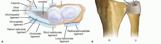 The distal radius has three articular surfaces: the scaphoid fossa, the lunate fossa, and the sigmoid notch.The radius articulates with and rotates around the ulnar head via the sigmoid notch. The sigmoid notch has welldefined dorsal, palmar, and distal margins, whereas the proximal margin is indistinct.The distal radioulnar joint (DRUJ) and ulnocarpal relationships are maintained by numerous ligamentous structures (FIG 1A).The interosseous membrane is a complex structure with a thickened central portion. It almost completely spans the radius and ulna, acting as a hinge for forearm rotation.The diaphysis of the distal half of the ulna is supplied by small segmental branches from the anterior and posterior interosseous arteries. These enter the ulna in 1- to 3-cm intervals from the direction of theinterosseous membrane and must be protected during the surgical approach.26P.1046The dorsal capsule of the DRUJ contains two ligaments: the proximal metaphyseal arcuate ligament and the distal radioulnar ligament. The palmar capsule is composed of a single radioulnar ligament.1The TFCC spans the ulnocarpal joint and connects the distal radius to the distal ulna (FIG 1B). The TFCC functions to cover the distal ulna, to partially dampen and transmit a portion of the axial load of the wrist through the ulna, to stabilize the DRUJ, and to provide support for the ulnar side of the carpus.The TFCC contains a central avascular articular disc composed of types I and II collagen. It is of variable thickness (average, 2 mm) and chiefly functions in load transmission between the ulnar head and ulnar carpus.The articular disc is connected to the peripheral palmar and dorsal radioulnar (marginal) ligaments, which originate on the medial border of the distal radius and insert into the base of the ulnar styloid at the fovea. These ligaments are composed of linear type I collagen and are stabilizers of the DRUJ.The ulnolunate and ulnotriquetral ligaments originate from the ulnar fovea and pass palmar to the palmar radioulnar ligament. They traverse the palmar surface of the TFCC to insert on their respective carpal bones. These ulnocarpal ligaments stabilize the ulnar side of the carpus relative to the ulna and resist carpal supination.The periphery of the TFCC is supplied by dorsal and palmar branches of the anterior interosseous artery and the ulnar artery. Because of this vascular distribution, injuries to the periphery of the TFCC are capable of healing and are often amenable to repair. Injuries to the central avascular portion of the articular disc do not heal in a predictable manner and are often treated with débridement.