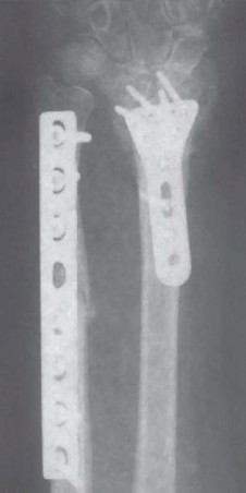 FIG 4 • Ulnar impaction syndrome in a 73-year-old woman after distal radius fracture nonunion and subsequent collapse. She underwent open reduction and internal fixation of the radius fracture as well as ulnar shortening osteotomy to correct the posttraumatic ulnar positive variance. Severe osteopenia prevented stable fixation of the ulnar osteotomy with the standard plate and necessitated a longer eight-hole DCP.